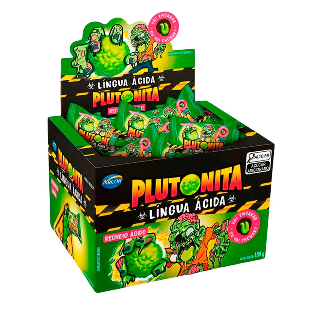 O Chiclete Plutonita Língua Ácida possui casquinha crocante, com recheio ácido sabor limão. Contém 36 unidades