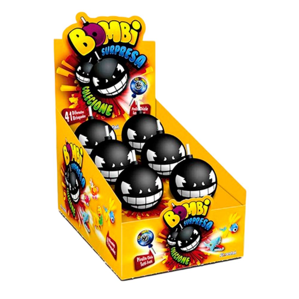 O Pirulito Surpresa Bombi chega com um formato de bomba com um pirulito sabor tutti frutti e com chiclete dentro e com supresas variadas para montar. Cada caixa vem com 12 unidades de 140g cada, ideal para lembrancinhas, kits infantis ou simplesmente adoçar o dia com um toque de encanto.